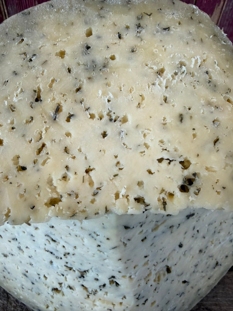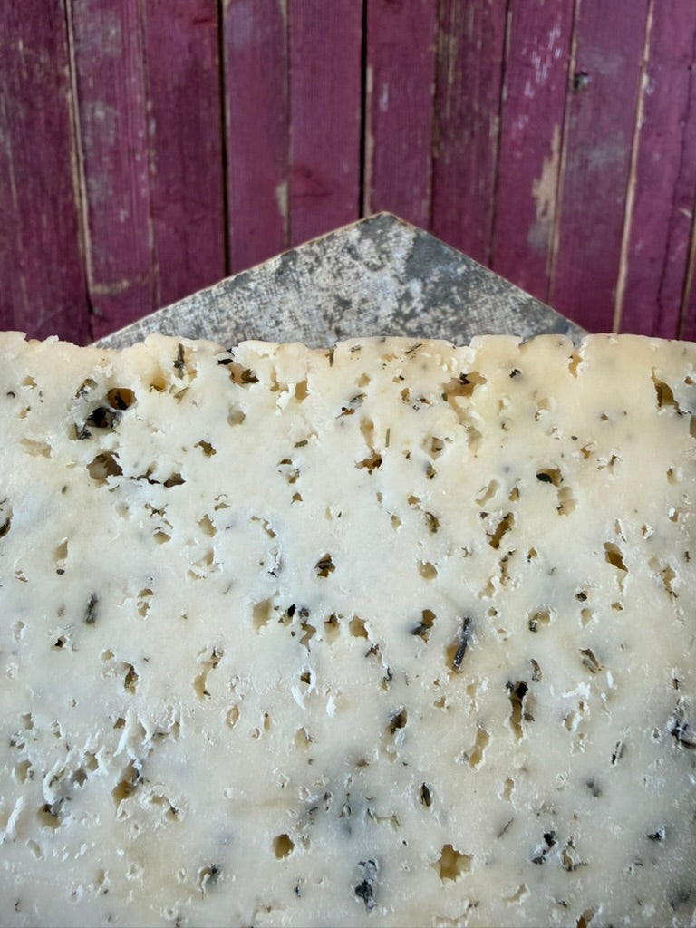 A rare cow’s milk variety from this normally sheep-oriented farm, this cheese is a stand-out among its peers. Studded through with fresh nettles, this cheese comes to us either tasting like broccoli cheddar soup or spinach and Swiss – what do YOU think it tastes like?